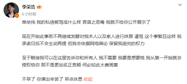 随后,1点46分,李荣浩发文回应:现在开始此事若不再继续发酵,对我本人以及家人进行抹黑、谩骂,这个事暂且这样,我承诺日后不会主动再提,但我会依据网络舆论,保留我追究的权力。